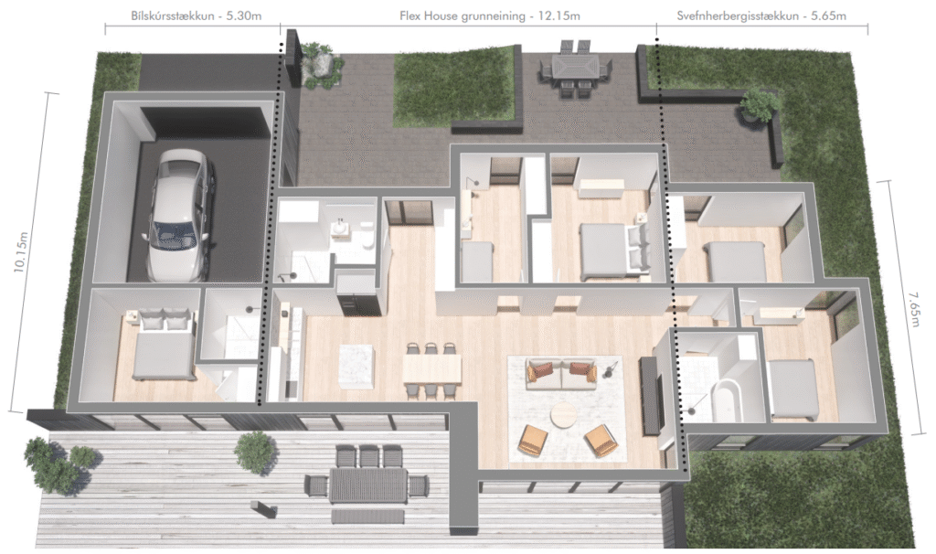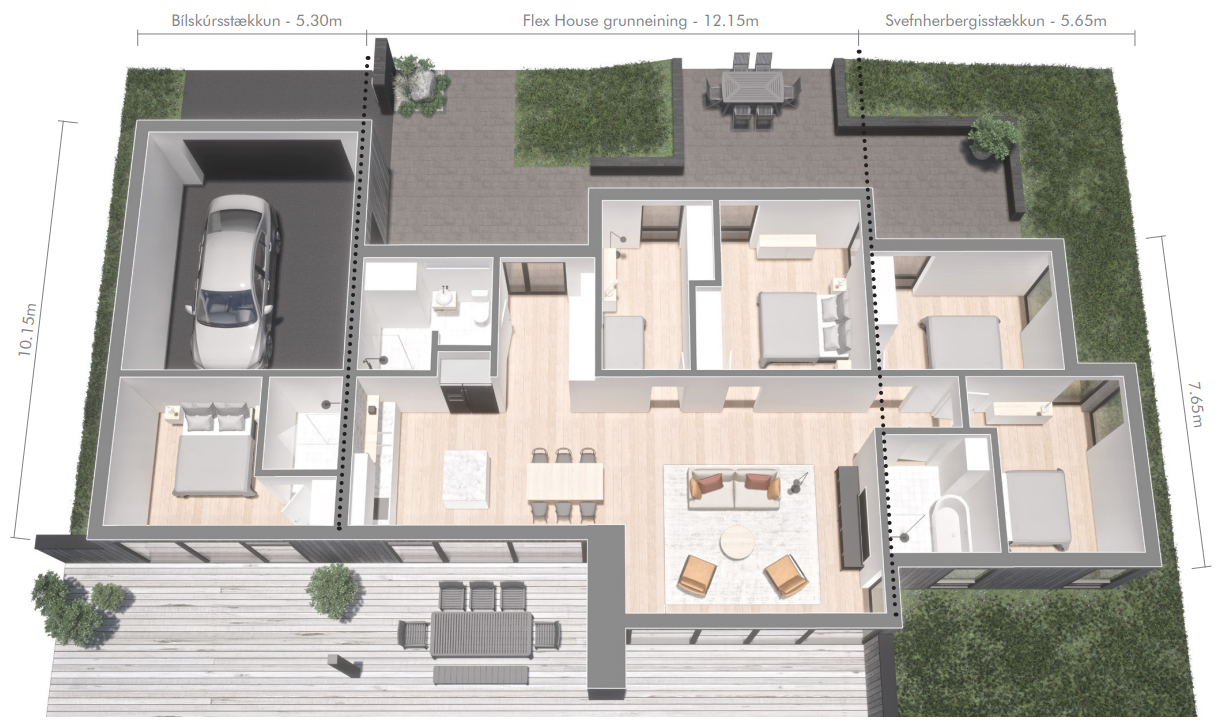 Flex – Family (201 m²), er fjögurra svefnherbergja einbýli með bílskúr og aukaherbergi með sérinngangi. Í þessari útgáfu eru alls 3 baðherbergi og því þægilegt hús fyrir fjöruga fjölskyldu.